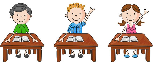 Comic Schule Kinder Sitzen Am Tisch Stock Vektor Art und Sumber : www.istockphoto.com